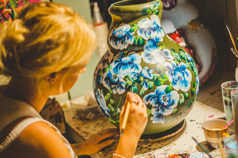 'This is where the magic happens! (Ik moet lachen terwijl ik het typ) Soms begrijp ik niet hoe ik al die vazen in zo’n klein mini ateliertje krijg! En vergeet m’n 3 kids niet die nemen geregeld een bezoekje aan hun moeder met daarbij hun eigen ongevraagde attributen 🧸🪀🚂🪁…Ondanks al dat chaotische zou ik het niet anders willen. Deze plek is m’n heilige domein! De enige ruimte waar IK ( en niet Fiep, Morres, Neeltje en m’n kerel ) troep mag maken ZONDER op te ruimen! Waar ik mezelf opsluit, m’n koffie drink, muziekje opzet en schilder..' -Sharon de Jager